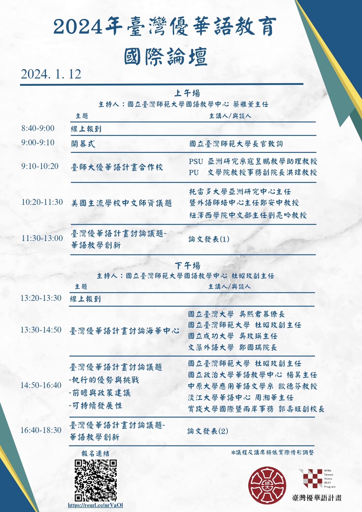 【台師大】2024年臺灣優華語教育國際論壇 研討會資訊 Conferences 2023-12-222023-12-29 論壇名稱:2024年臺灣優華語教育國際論壇論壇日期:臺灣時間113年1月12日報名網址:https://forms.gle/auC8AU5EXb9mQ3wp9