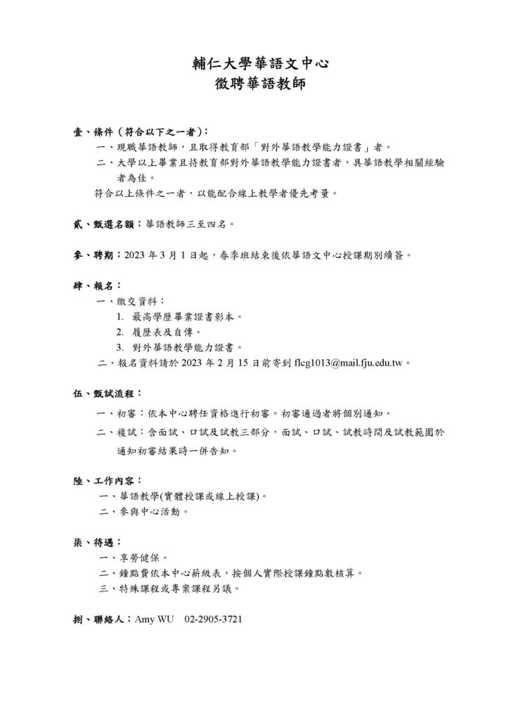 輔仁大學華語文中心誠徵華語教師3-4位,資訊請見附件。