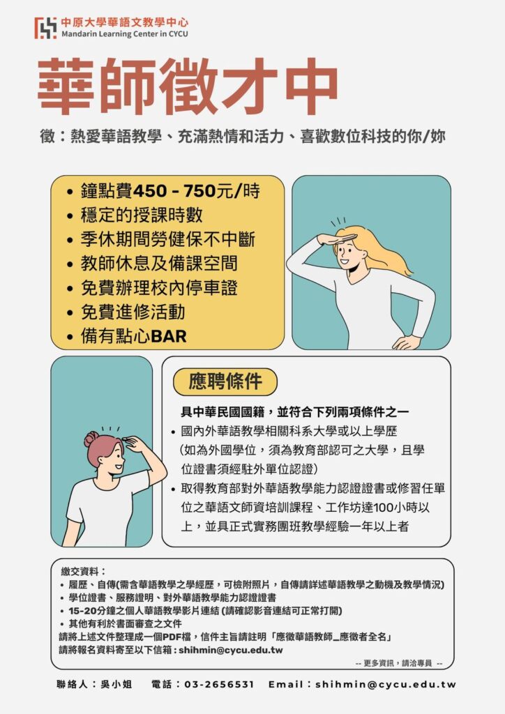 中原大學華語文教學中心誠徵華語教師,歡迎熱愛華語教學、充滿熱情和活力及喜歡數位科技的你/妳