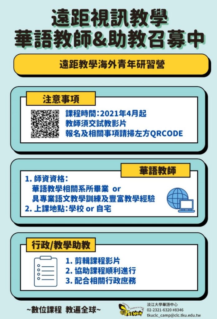 【招募】2021 海外青年華語遠距教學 教師&助教 招募中