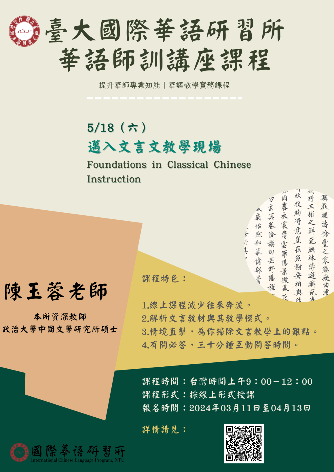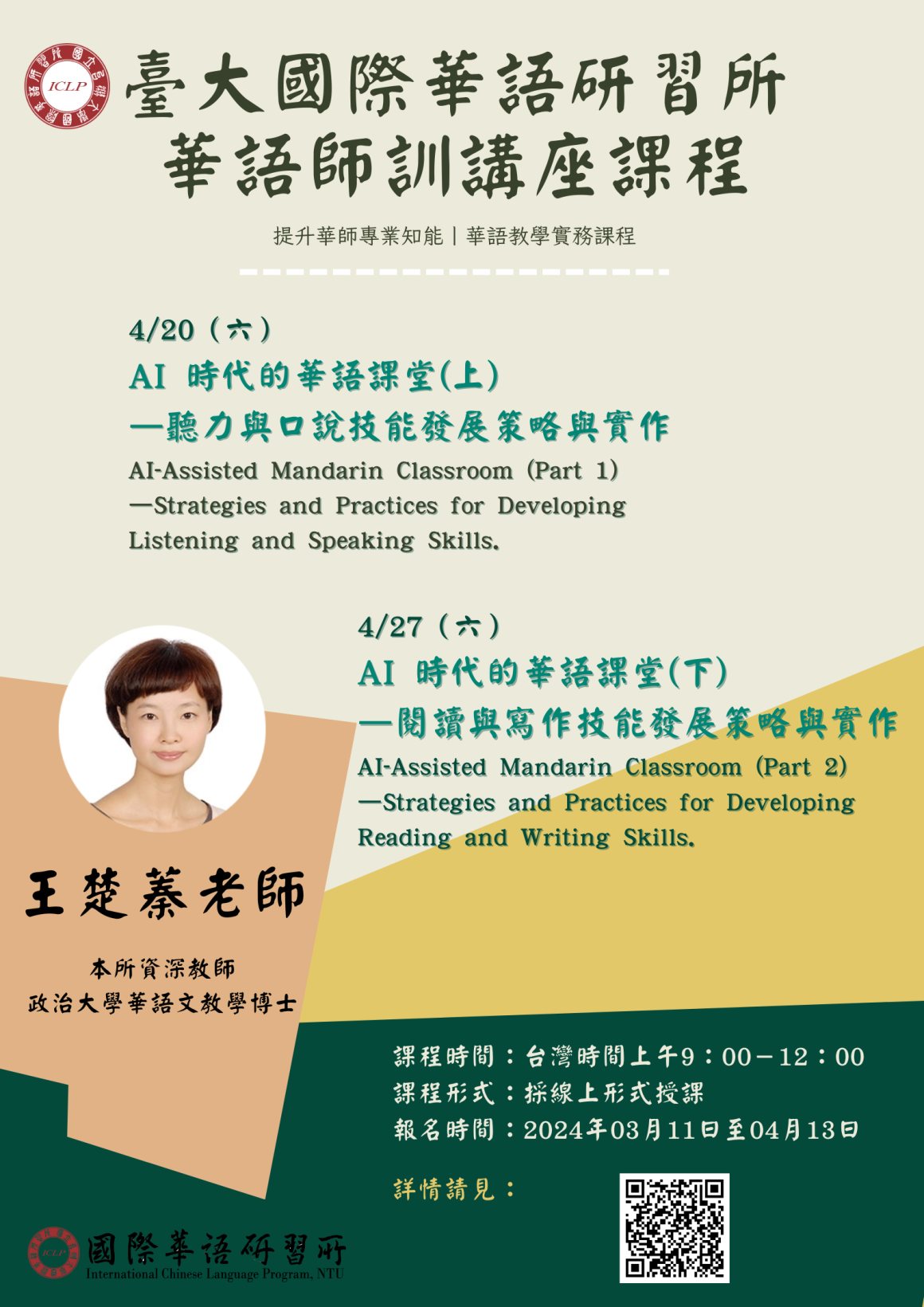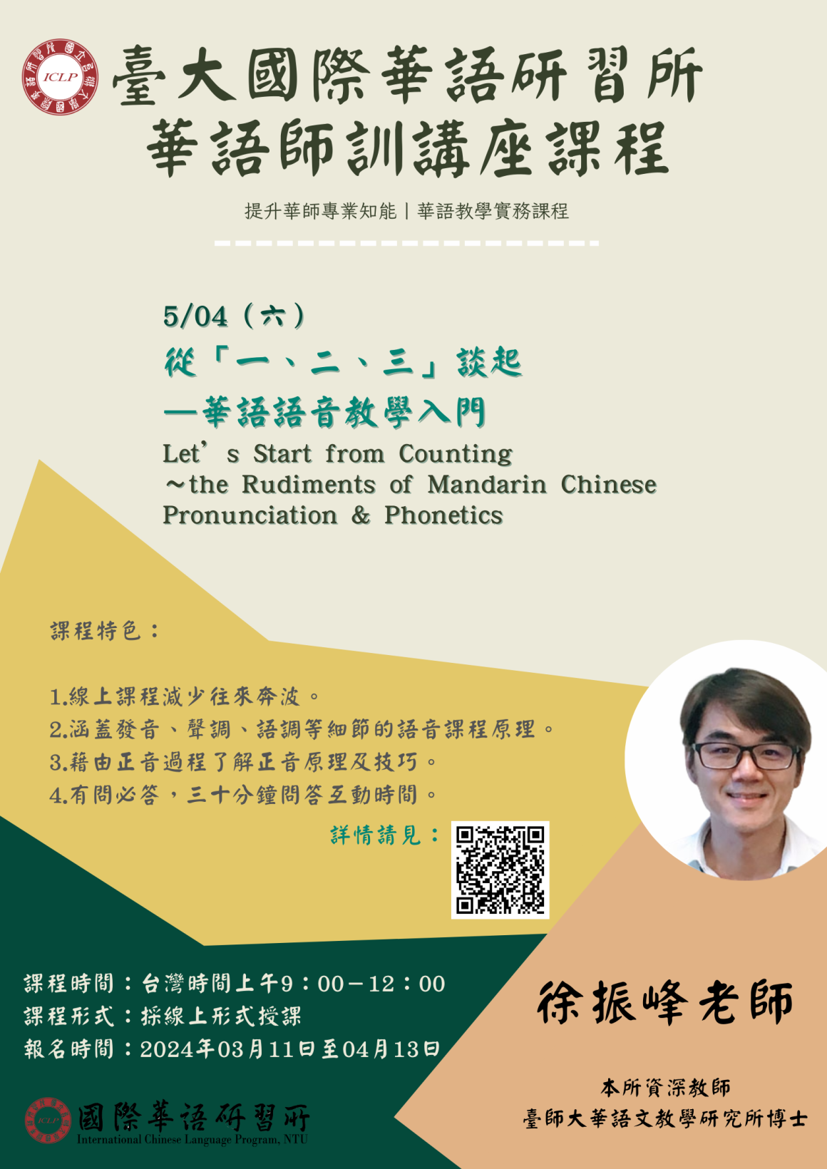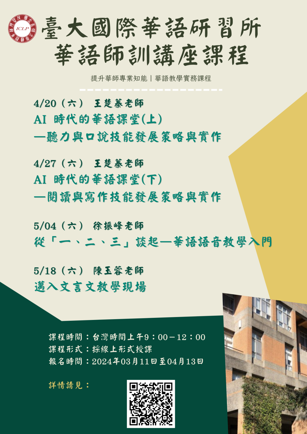 【臺大ICLP】華語師訓講座課程第一期課程現正招生中 師資培訓資訊 Training 2024-03-14 國立臺灣大學「ICLP華語師訓講座課程」第一期課程現正招生中,竭誠歡迎對華語教學有興趣的人士前來報名研習。 課程時間:2024年4月20、4月27、5月4日、5月18日,上午九時至十二時,採線上授課。→進入課程網頁報名時間:即日起至04月13日,額滿截止。