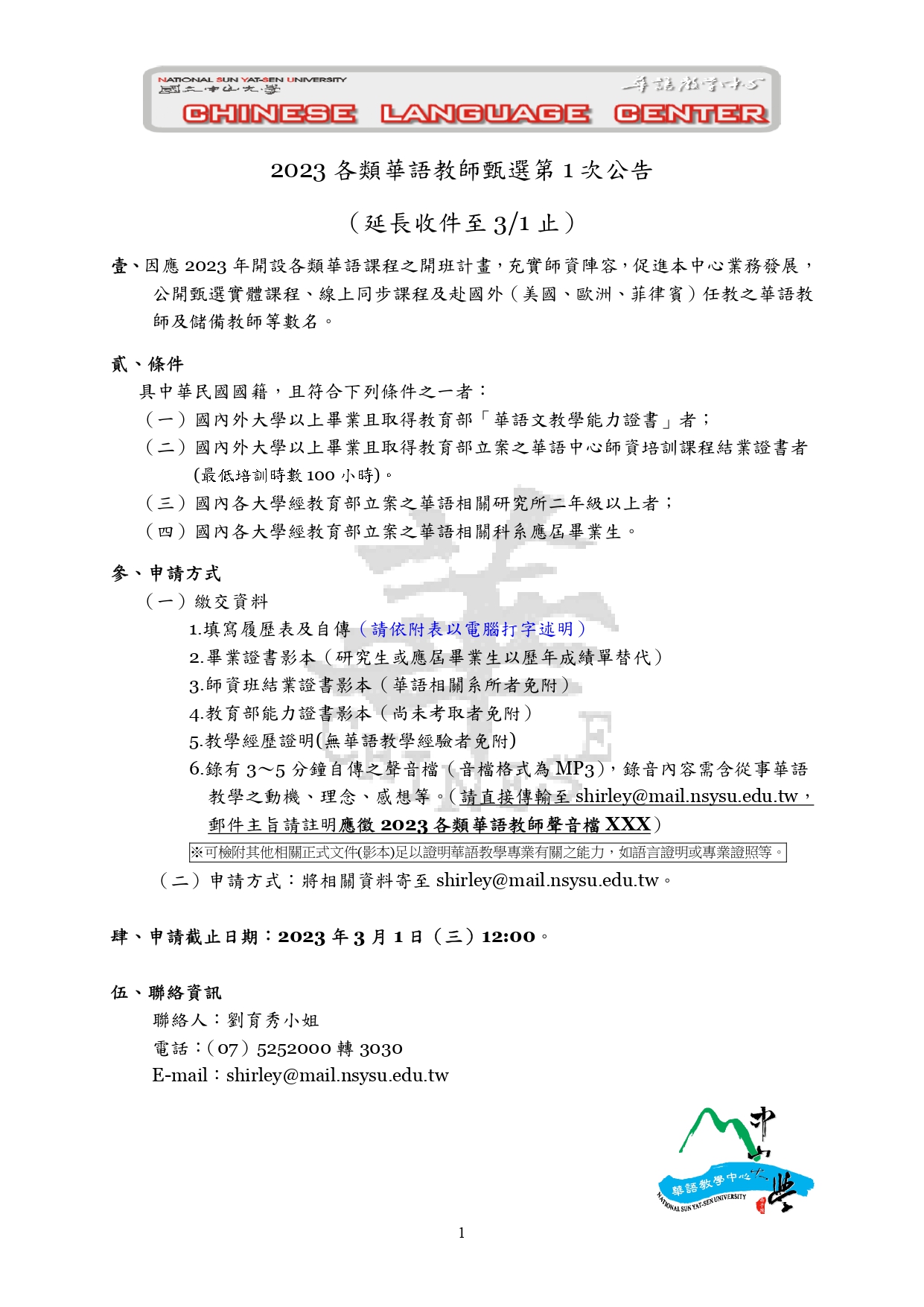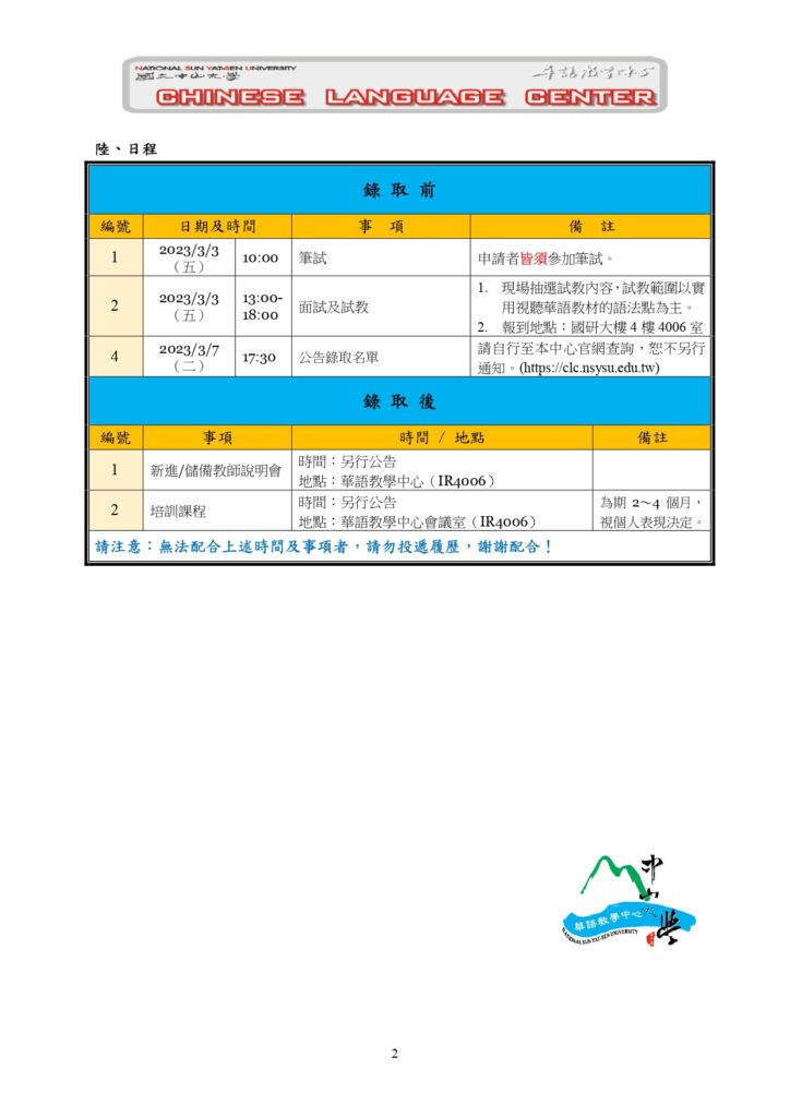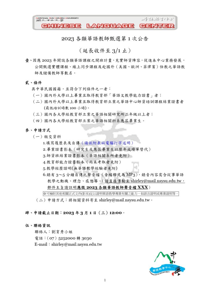 【 中山大學華語中心 】2023 各類華語教師甄選第 1 次公告,延長收件至三月一日。 求才看板 Jobs 2023-02-102023-02-10 國立中山大學國際事務處華語教學中心 2023 各類華語教師甄選詳情,請見公告。 2023年第1次華語教師甄選公告_CLCNSYSU_延長收件至3月1日下載 2023年第1次華語教師甄選公告_CLCNSYSU-form下載