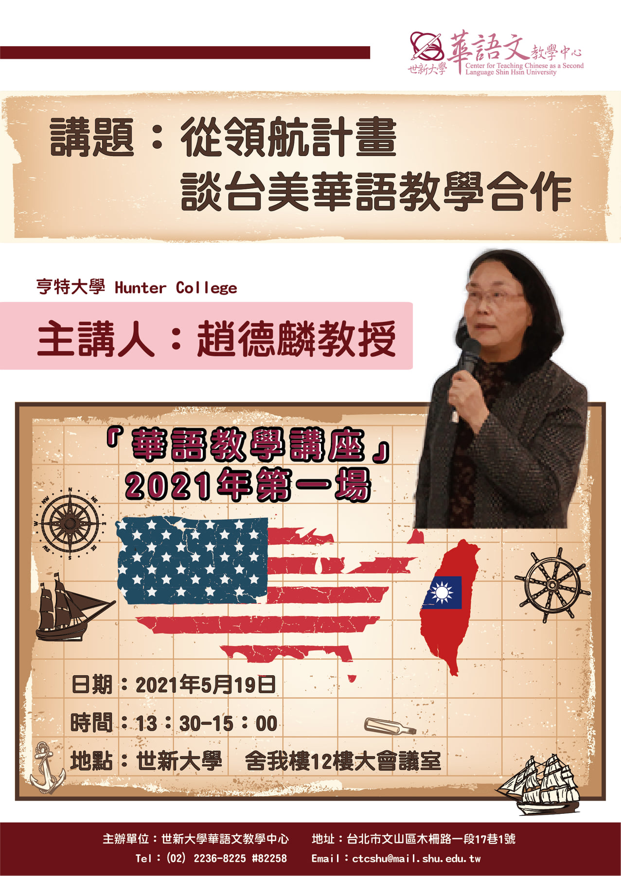 世新大學華語教學中心【華語教學講座】 未分類 2021-04-192021-04-19 世新大學華語教學中心將舉辦2021年第一場【華語教學講座】,主講人趙德麟教授,分享從領航計畫談台美華語教學合作,歡迎有興趣者一同與會 。 日期:5月19日(星期三) 時間:13:30-15:00 地點:世新大學_舍我樓12樓 大會議室 報名連結:https://forms.gle/zHVzQ2n4m2FGAZpB8