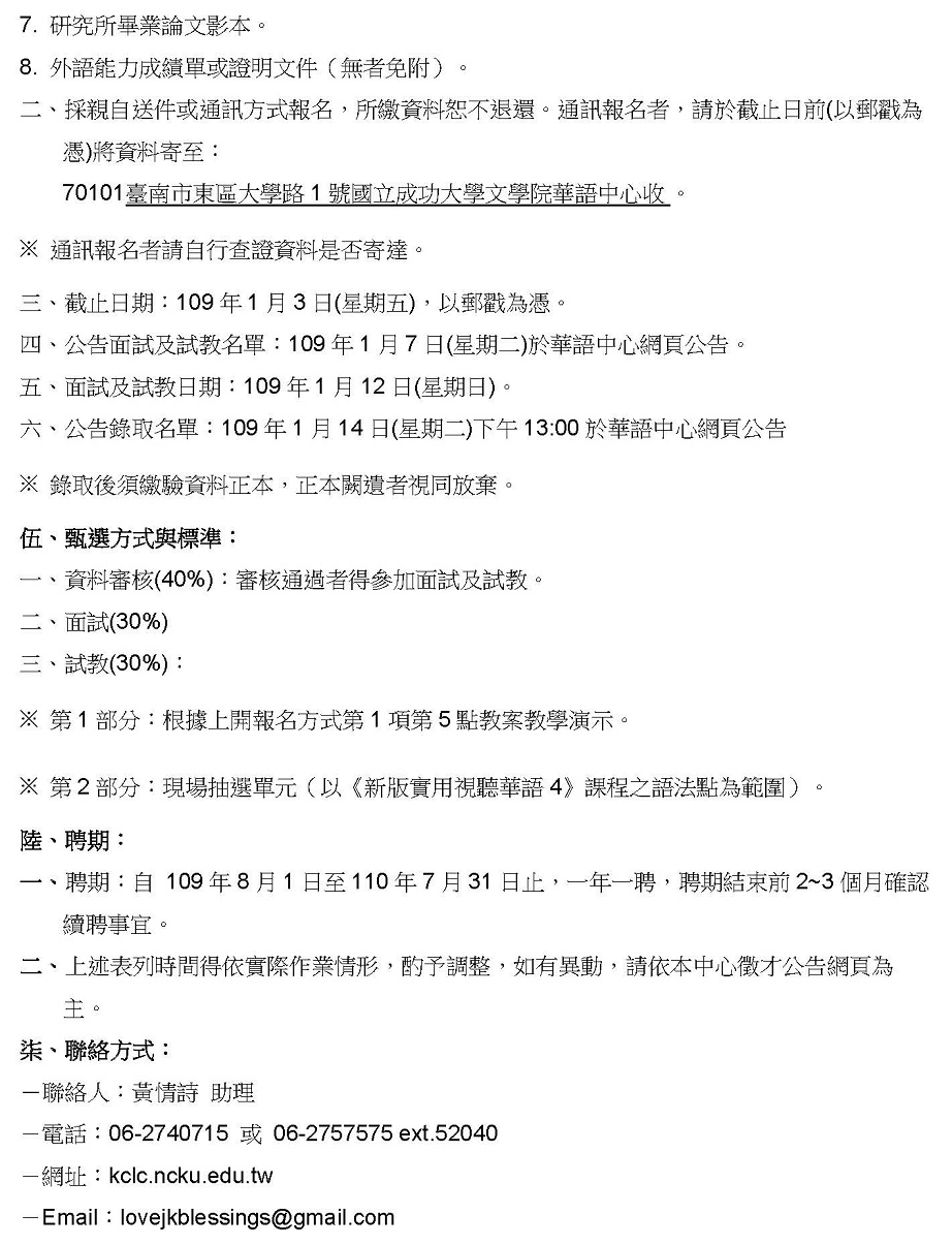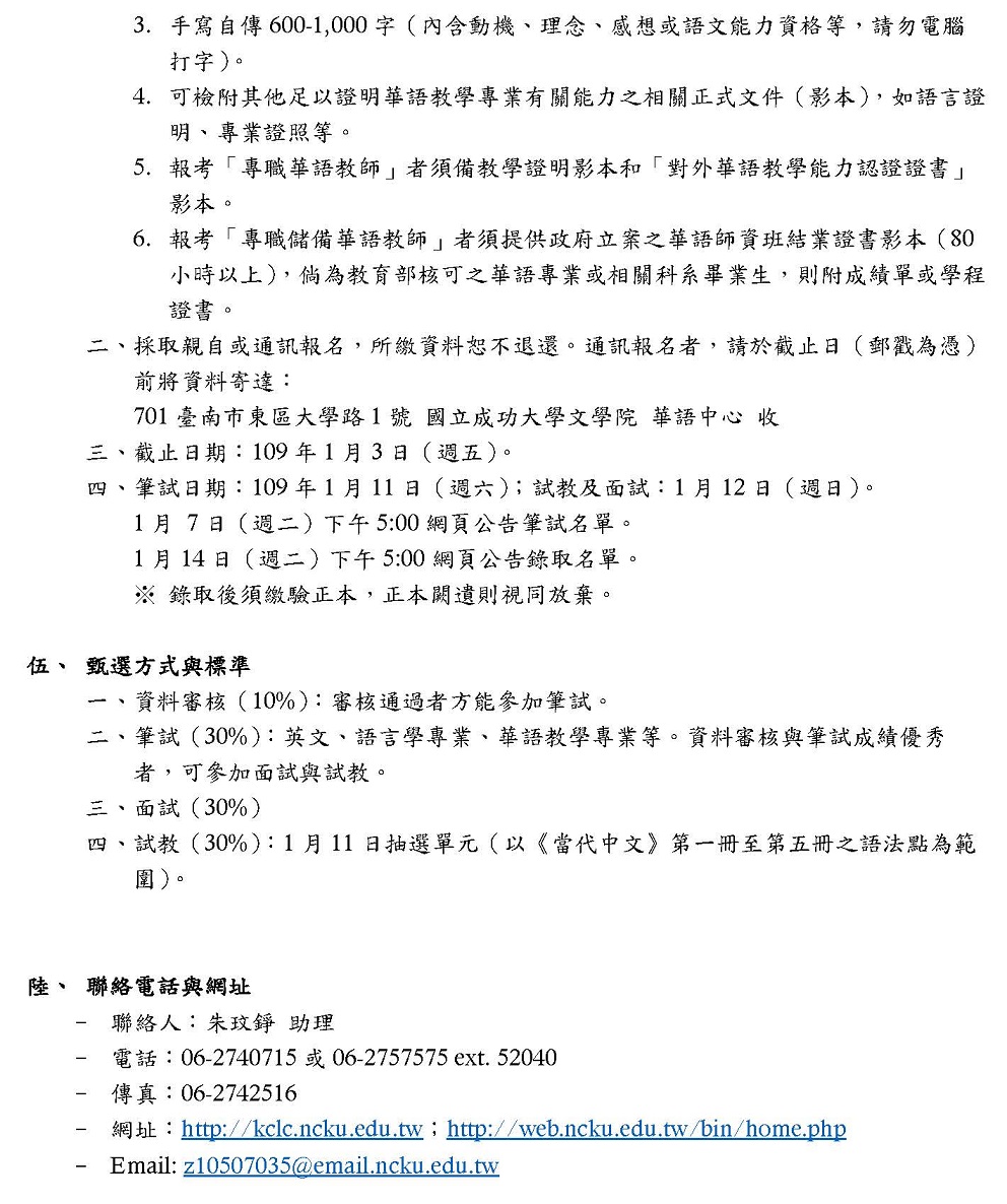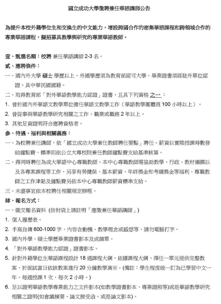 [成大華語中心] 專職華語教師及兼任華語講師徵求公告