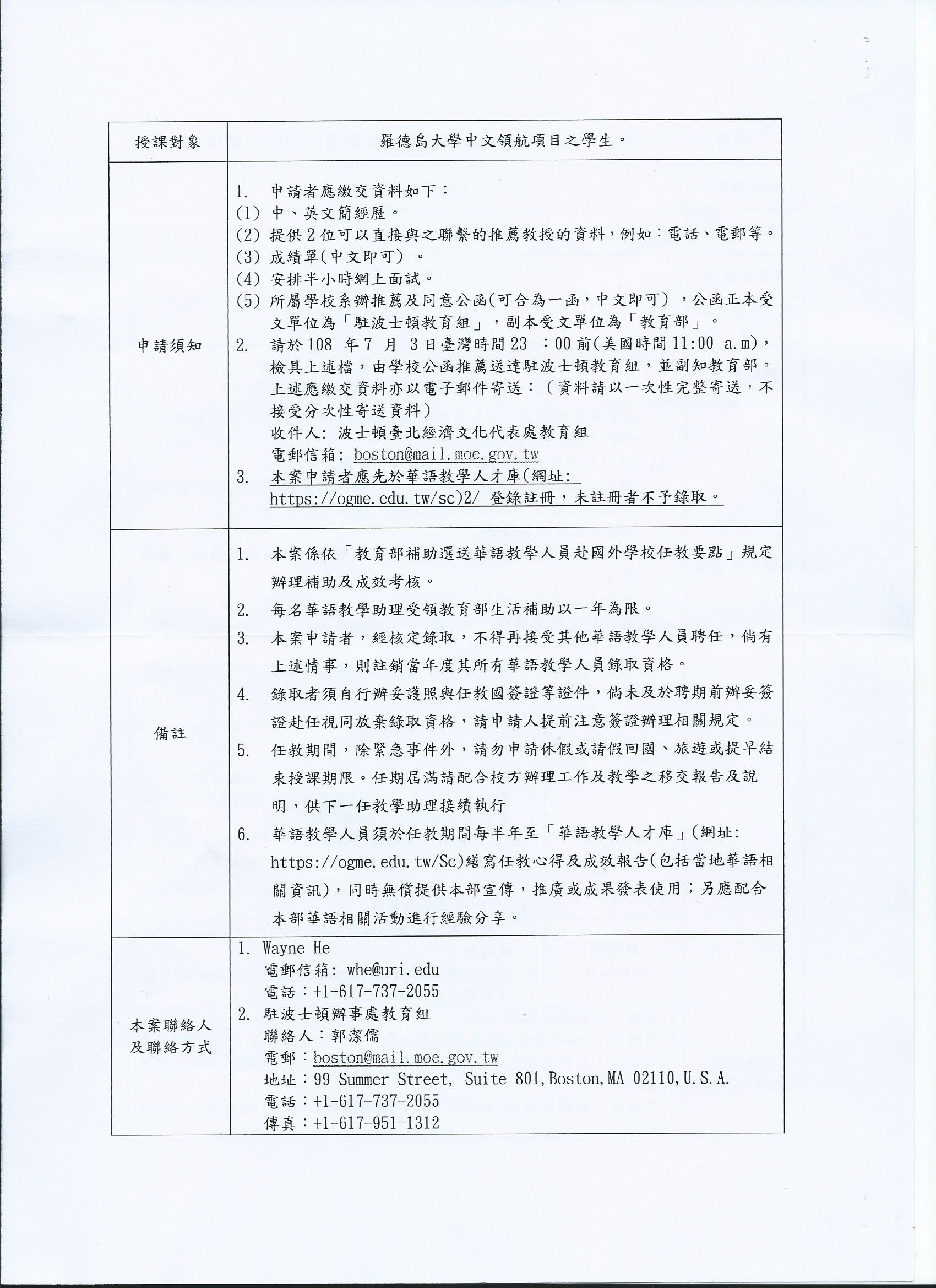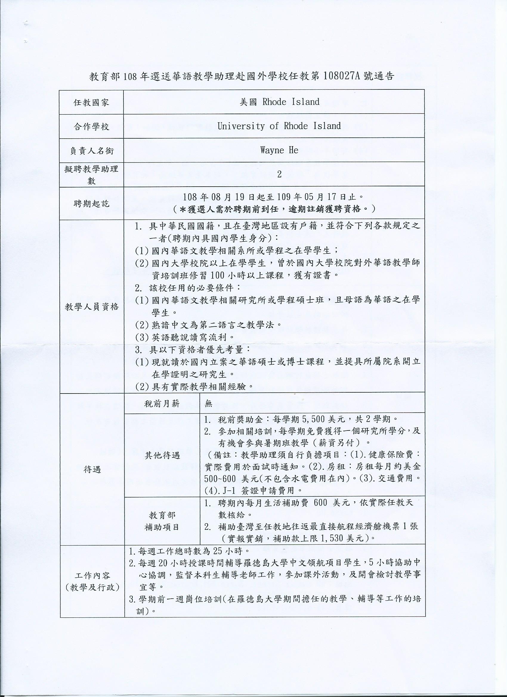 教育部選送華語教學助理赴國外學校任教第108027A號通告(美國)