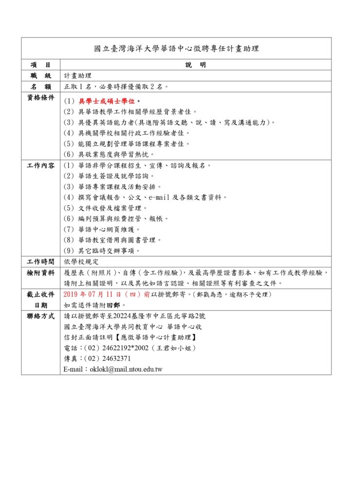 [海大華語中心]徵求專任助理乙名