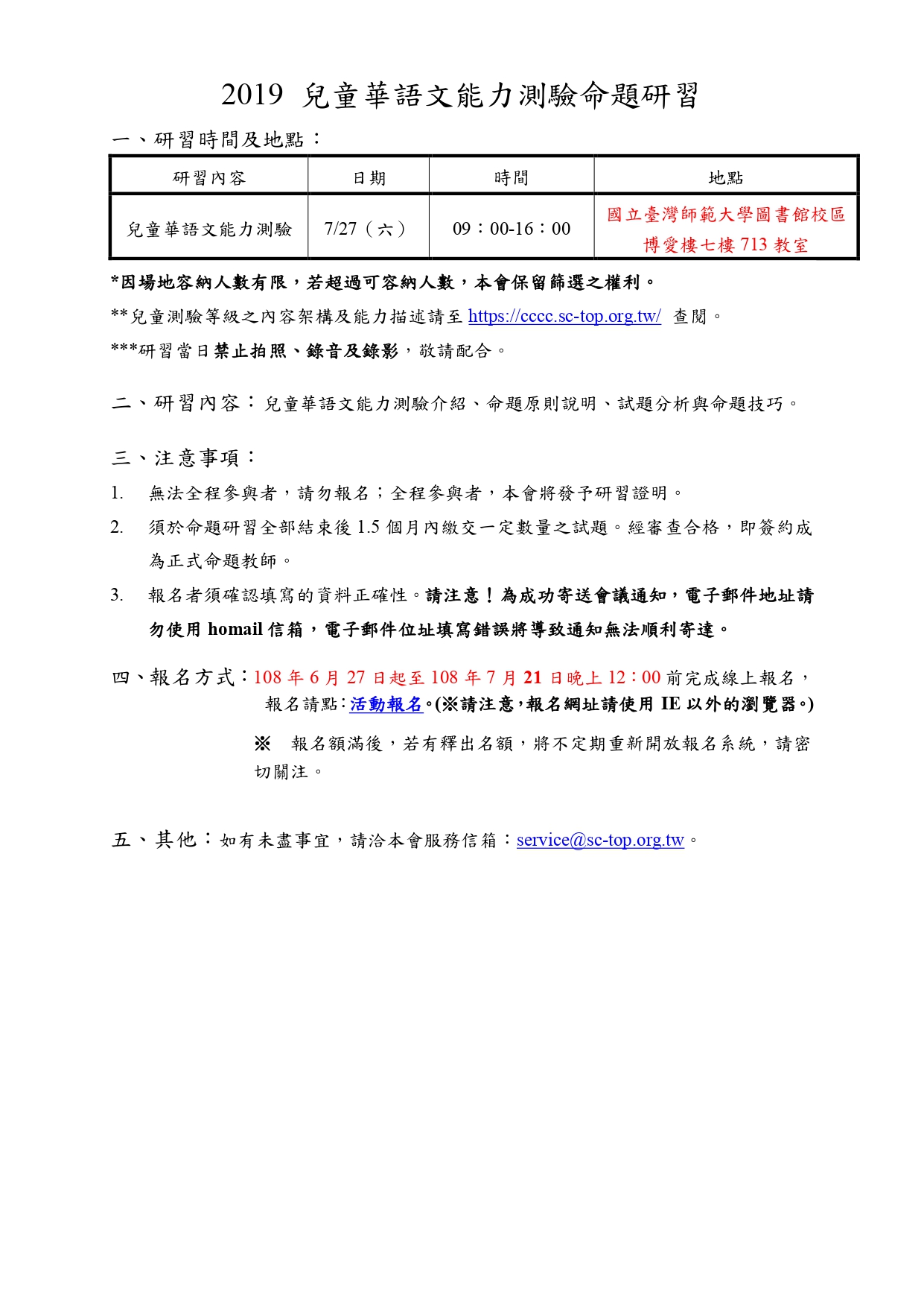 [華測會]7/27(六)舉辦「兒童華語文能力測驗命題研習」,報名自6/27至7/21