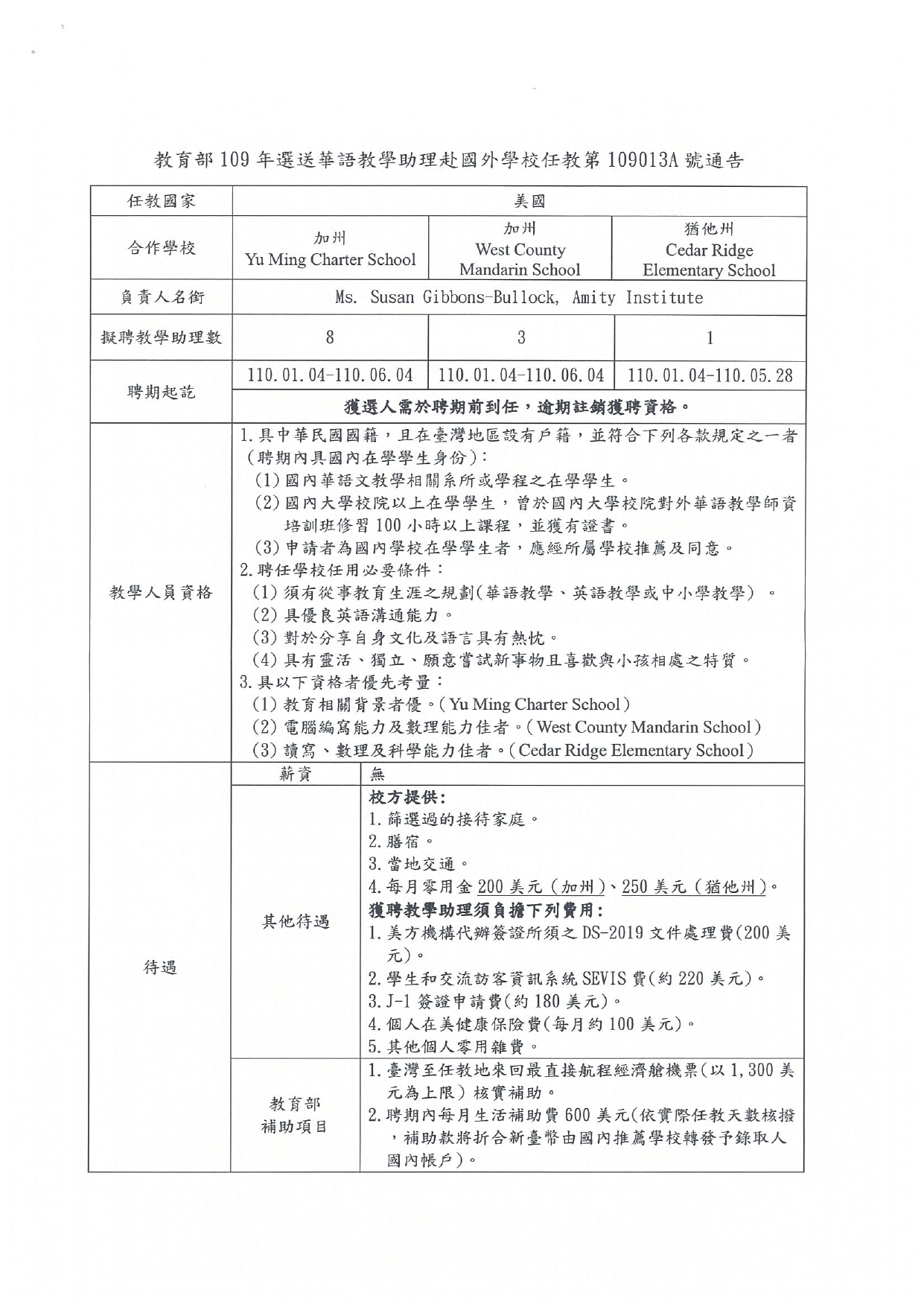 [109年教育部選送華語教師赴國外學校任教第109013A號通告(美國加州及猶他州)] 教育部選送 會員資訊 Information 華語文教師 Teacher/ Lecturer 2020-09-032020-09-03