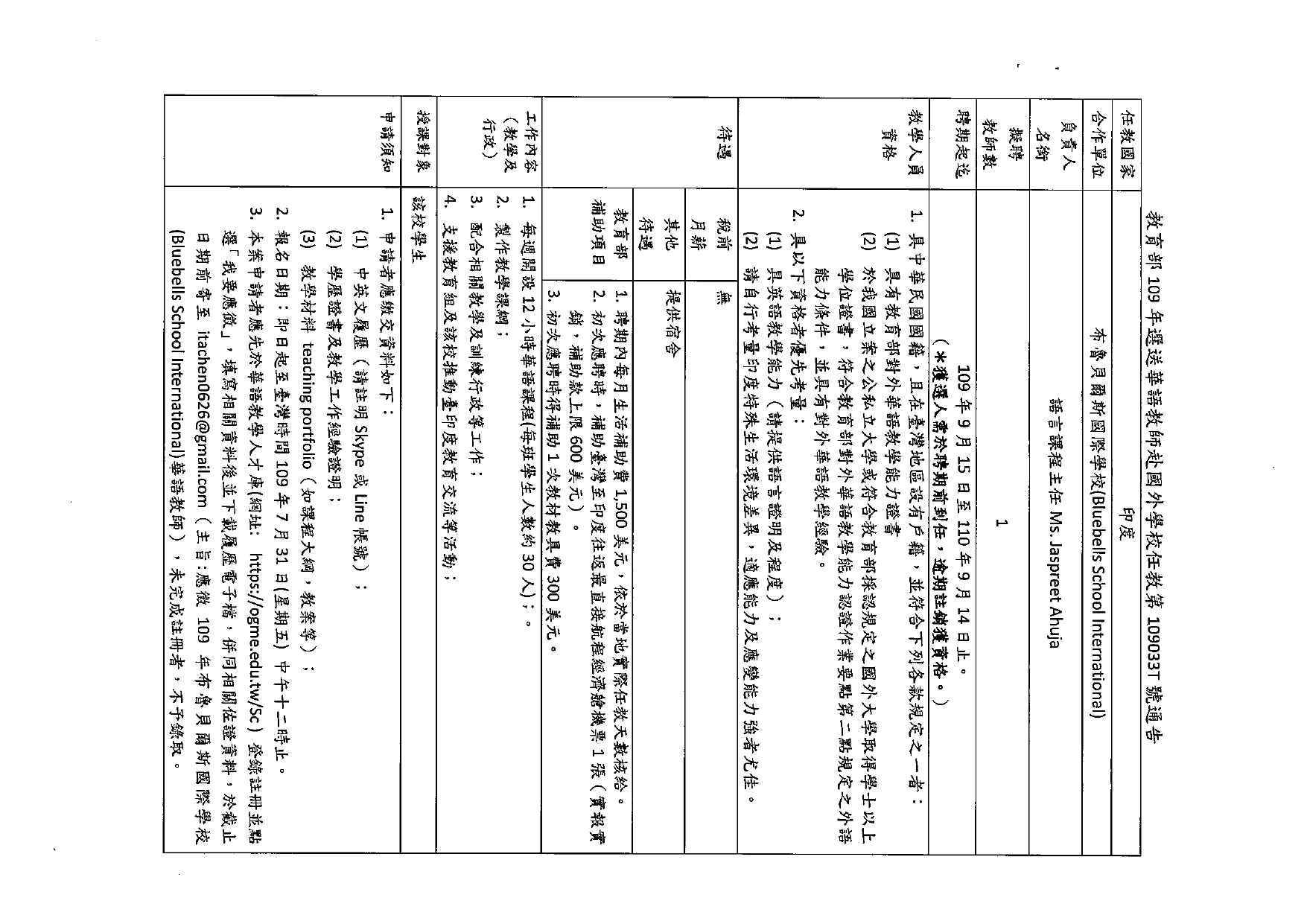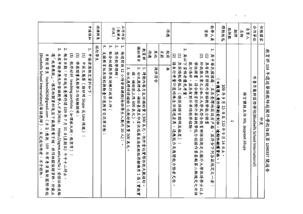 [109年教育部選送華語教師赴國外學校任教第109033T號通告(印度布魯貝爾斯國際學校)]