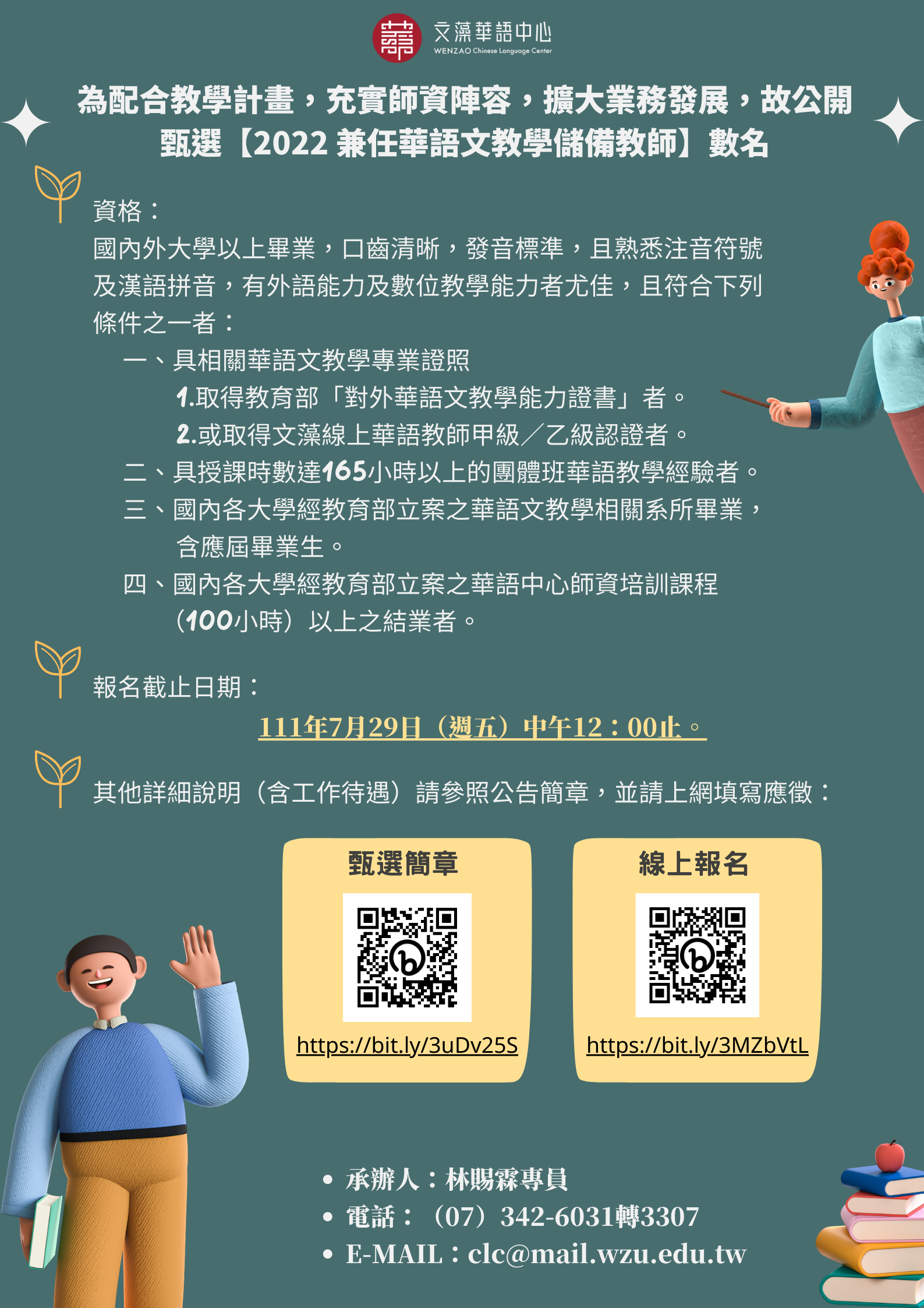 1. 凡對線上商務華語教學有興趣者,具國內外公私立大學學歷或大專在學學生,不限科系均可報名參加。