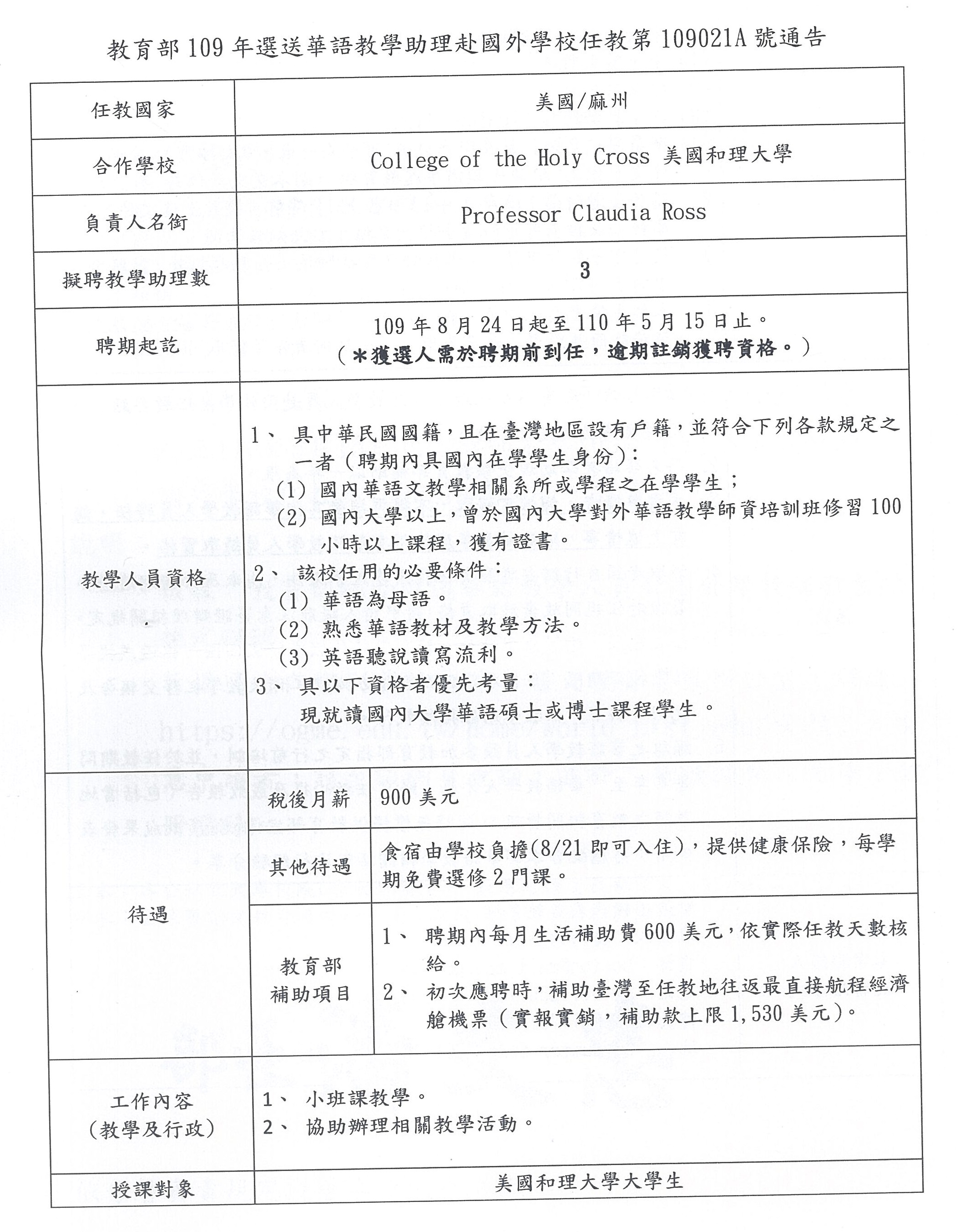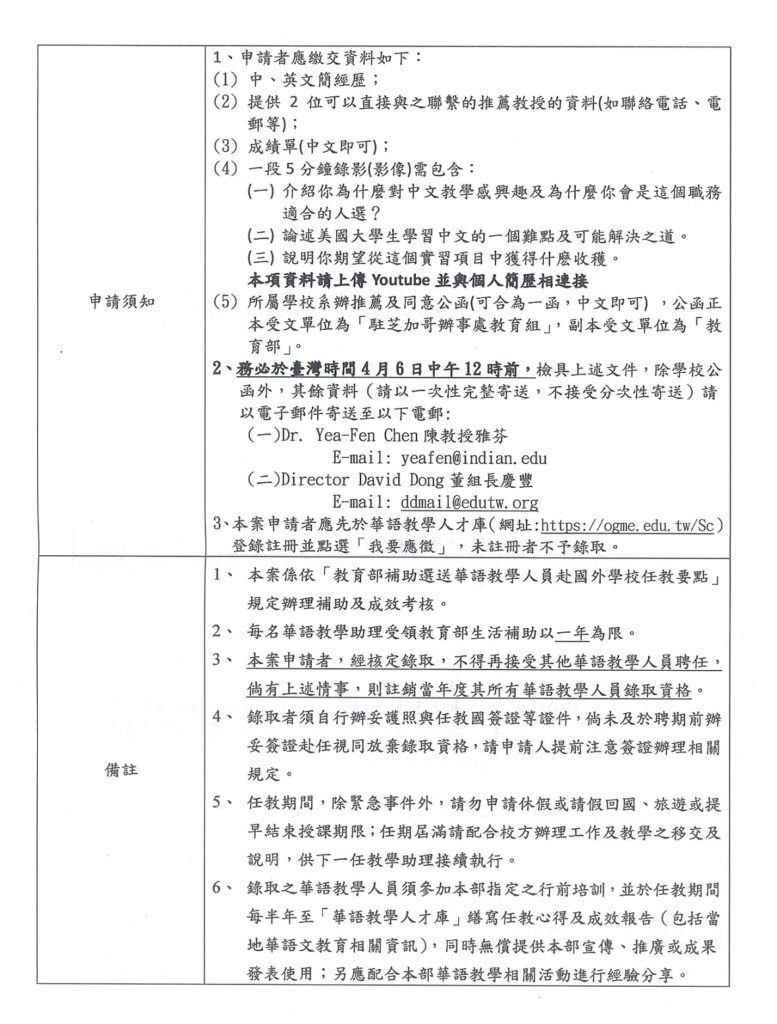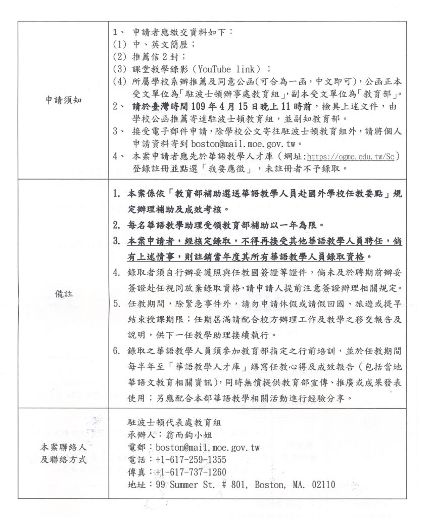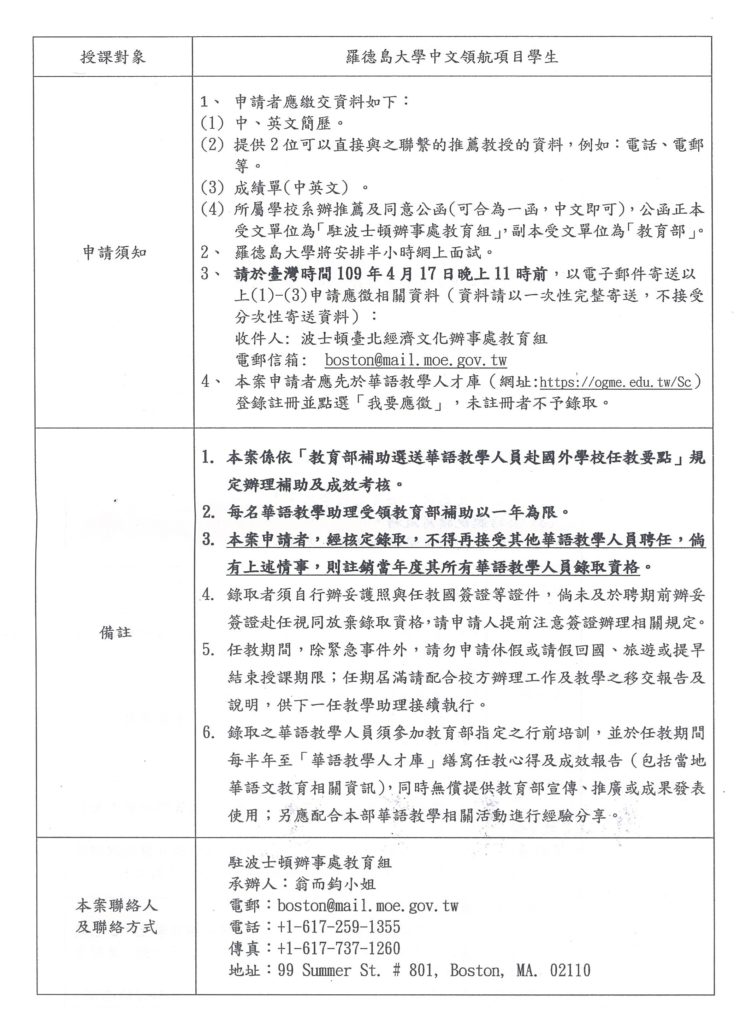 教育部選送華語教學助理赴國外學校任教第109017A號通告(美國)