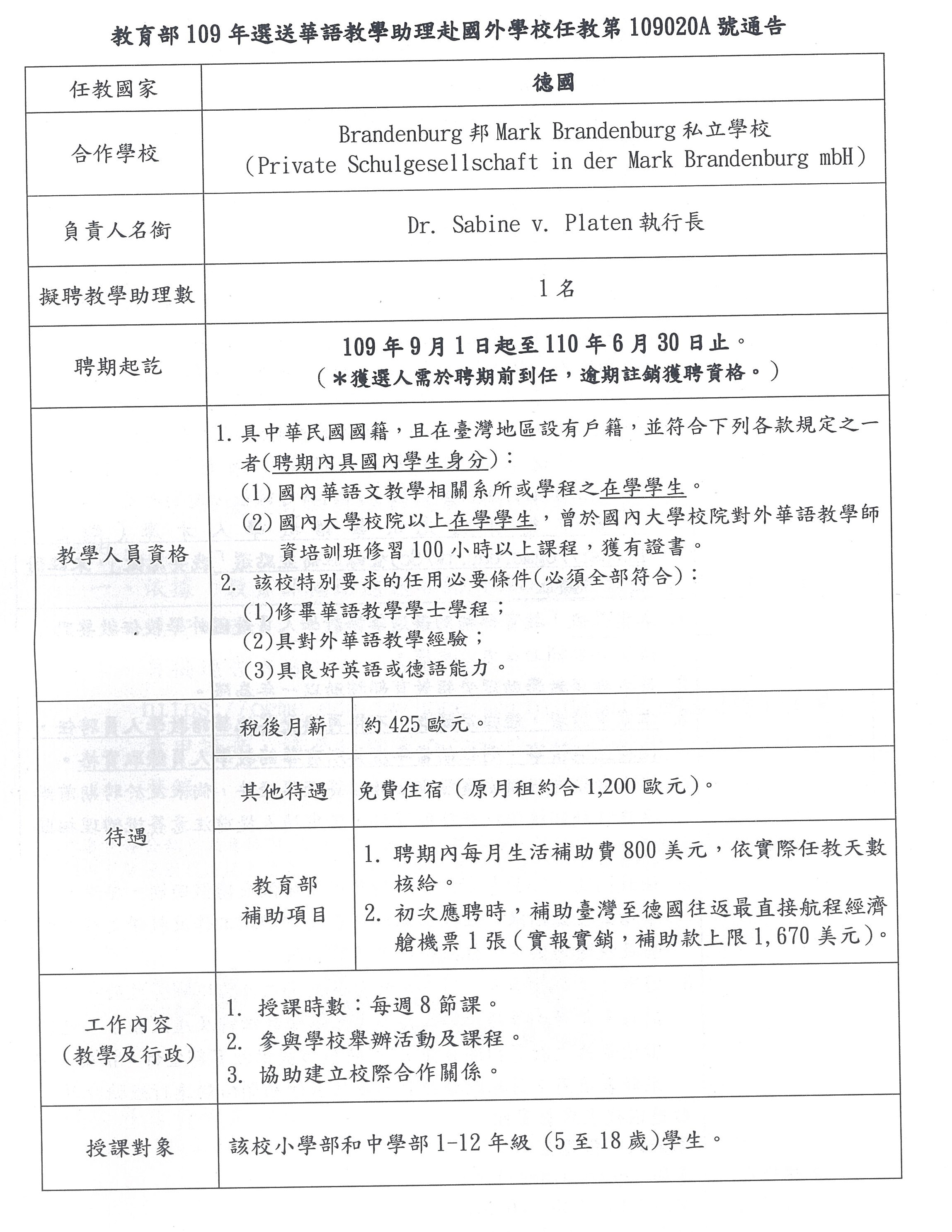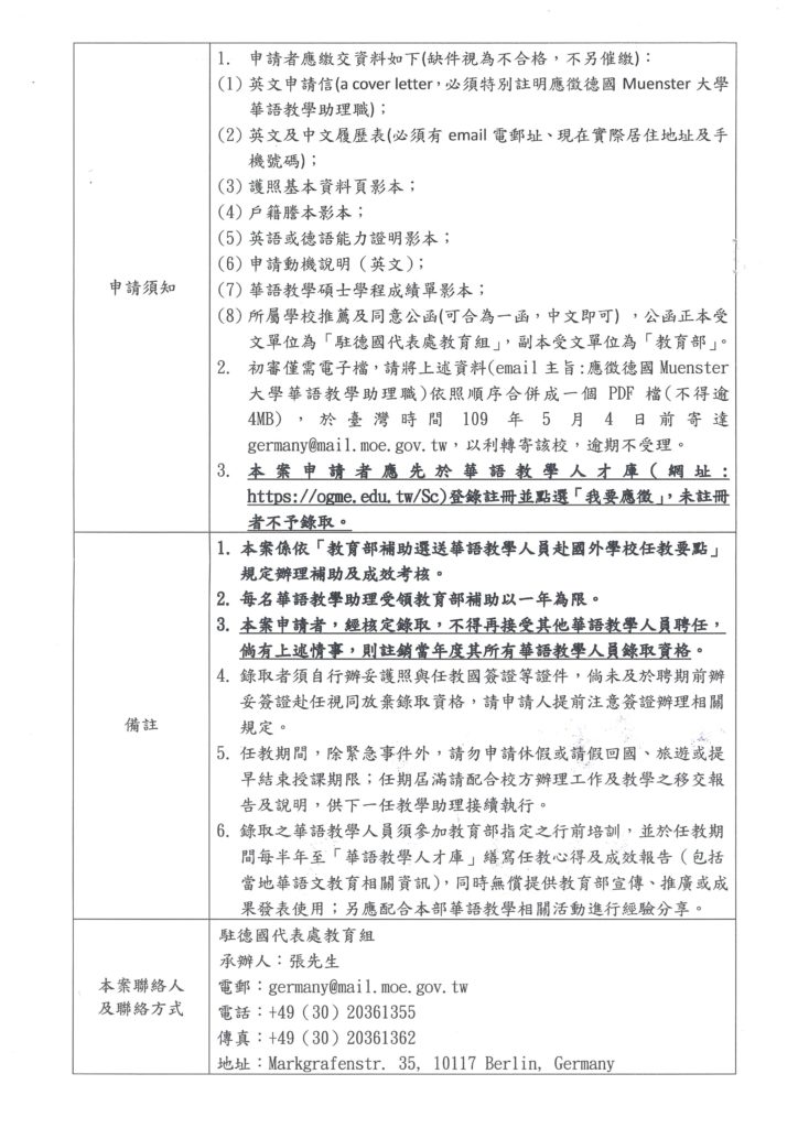 教育部選送華語教學助理赴國外學校任教第109019A號通告(德國)