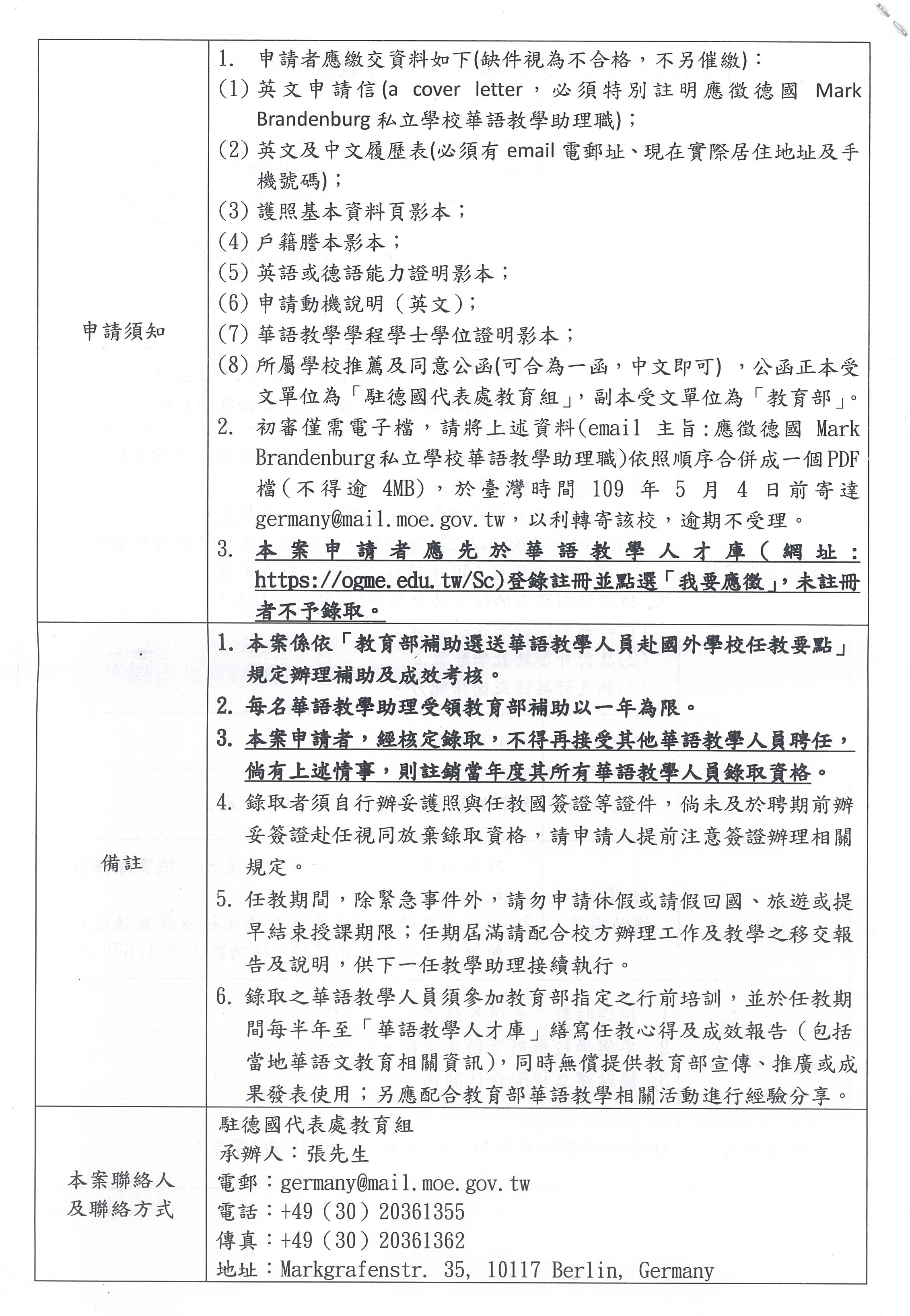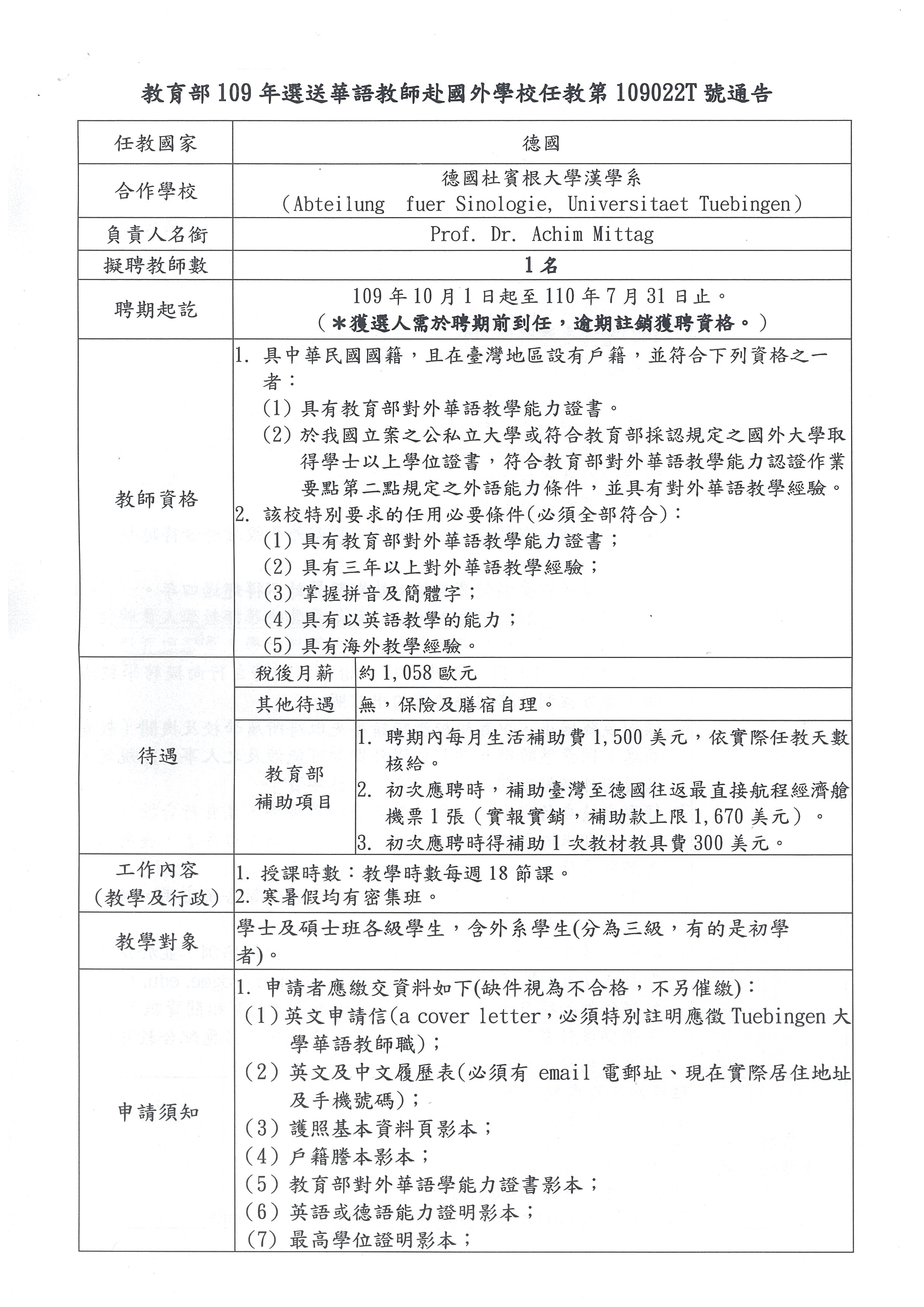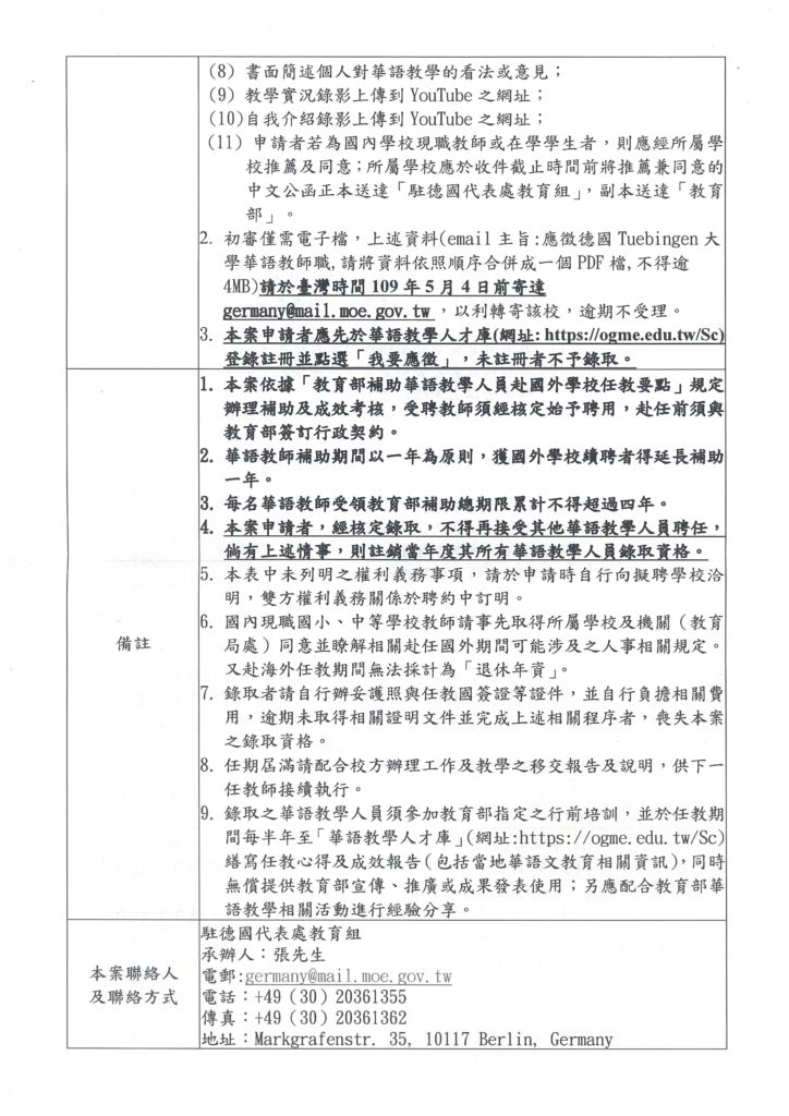 教育部選送華語教師赴國外學校任教第109022T號通告(德國)