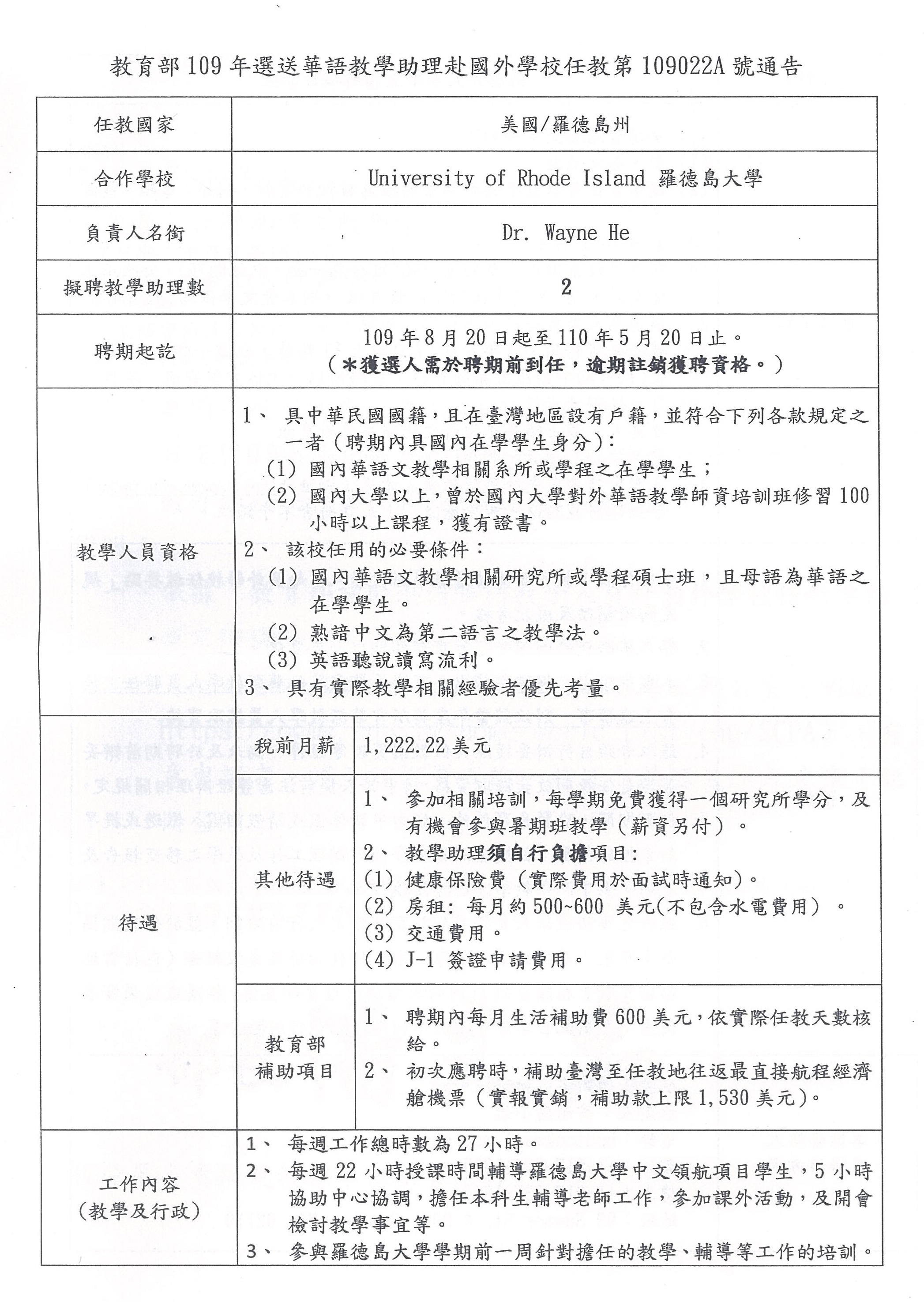 教育部選送華語教學助理赴國外學校任教第109022A號通告(美國)