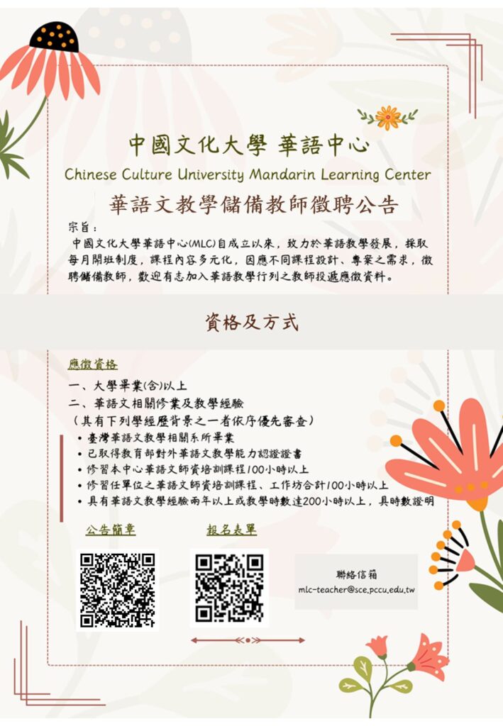 各位華語老師們好! 文化大學華語中心華語教師甄聘開始了,