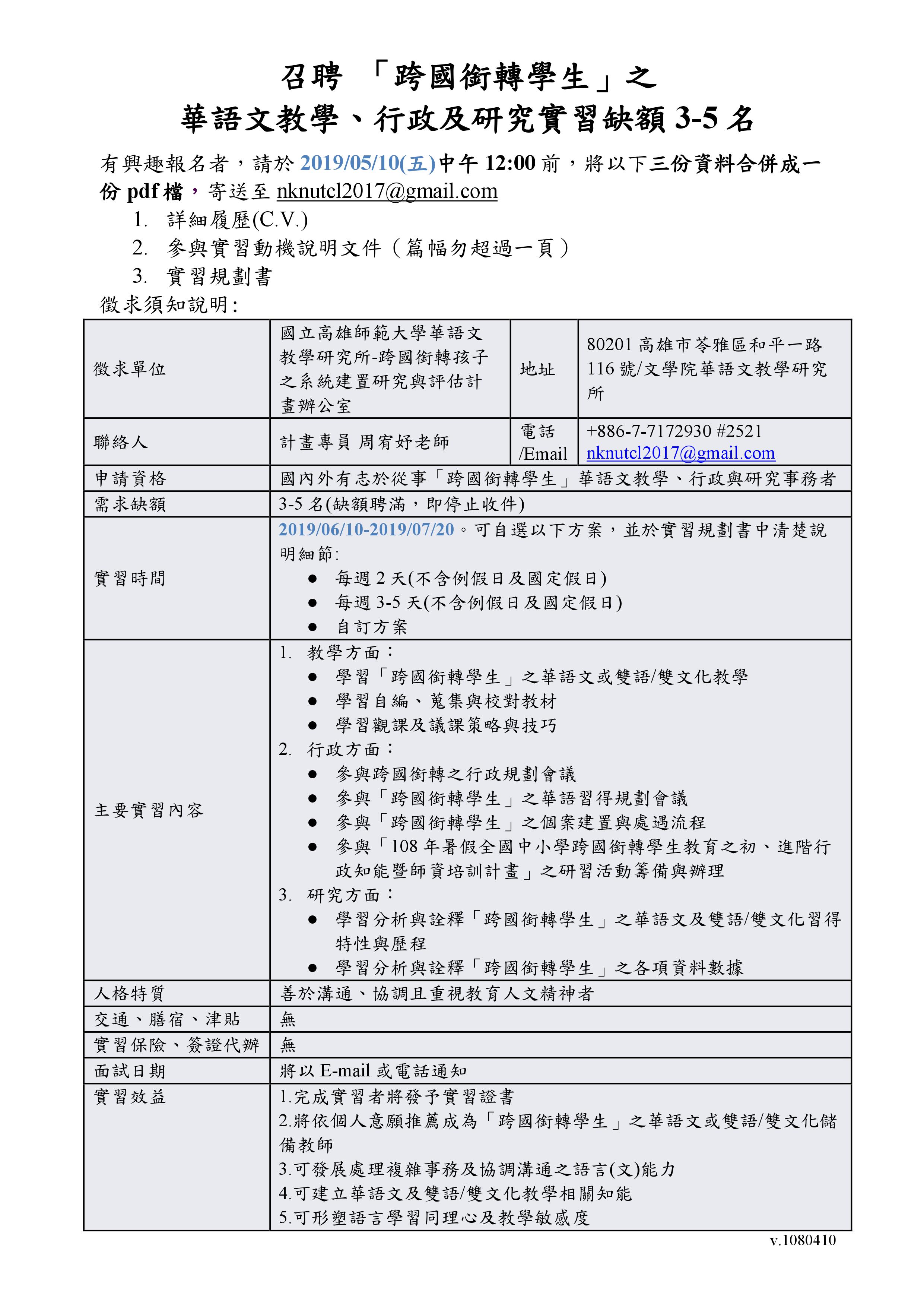 請於2019年5月5日前e-mail至陳小姐mlc-teacher@sce.pccu.edu.tw