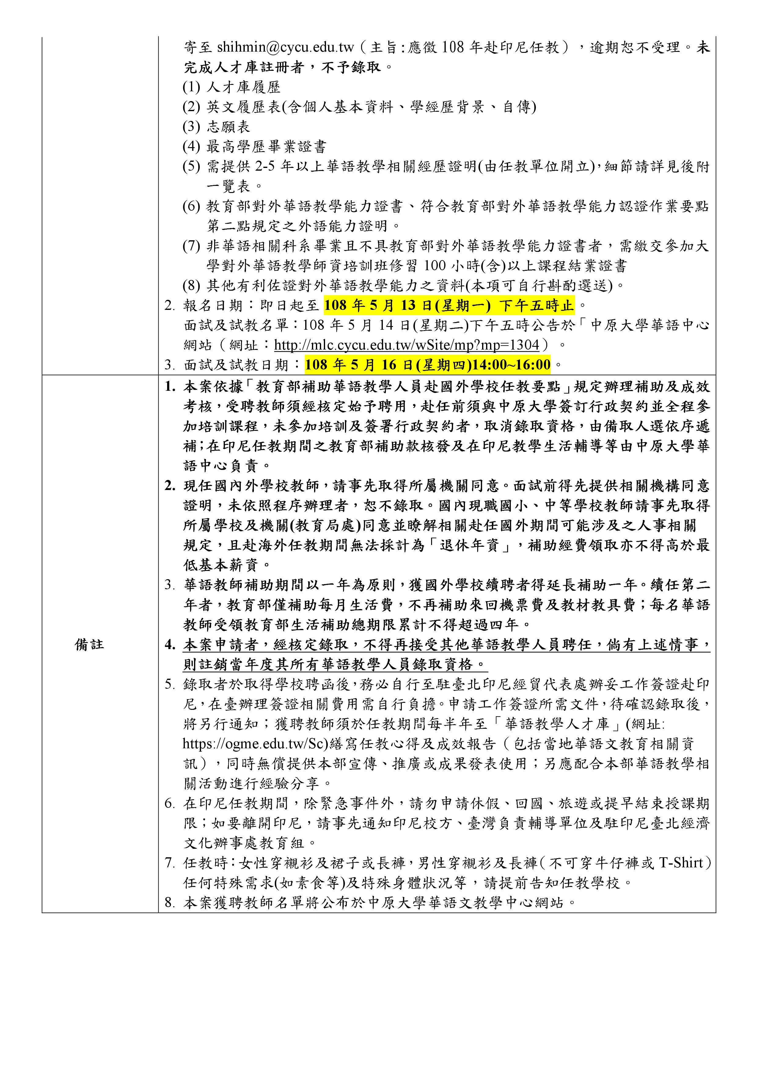 五、截止日期:請於108年4月30日前將您的個人基本資料表以email寄到tcasl@nccu.edu.tw,標題請註明「應徵兼任教師:申請者姓名」;並且於108年5月2日前將應檢附資料(一~五項)寄達「116台北市文山區指南路2段64號 政治大學華語文教學博碩士學位學程收」