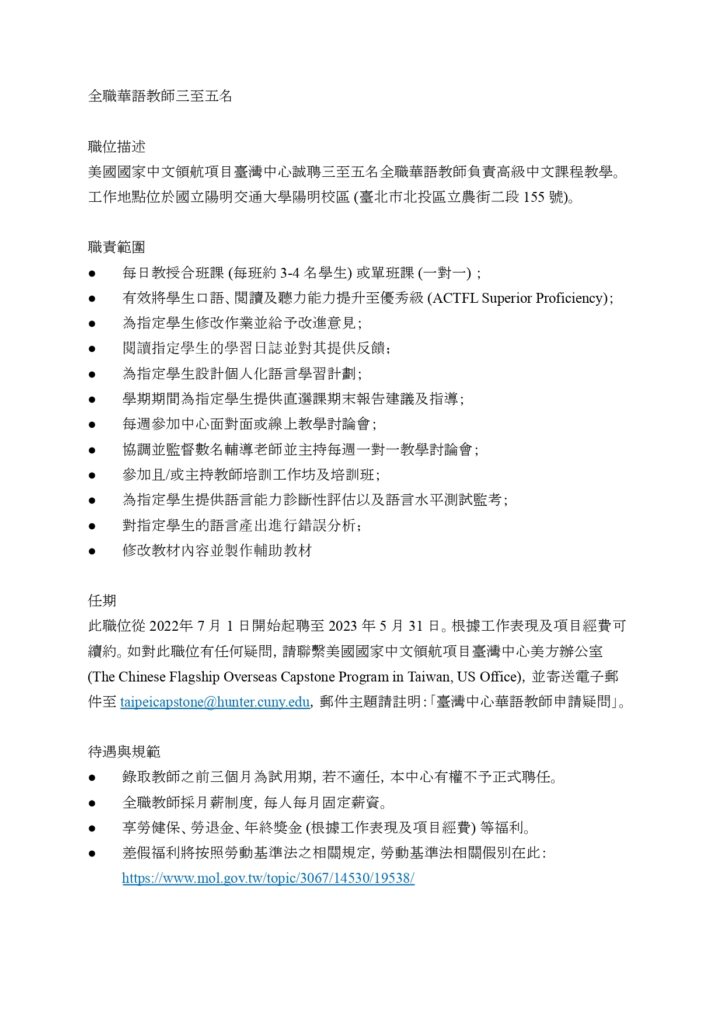 中原大學華語文教學中心將於今年暑假承辦僑務委員會海外青年線上研習營,徵聘多名華語教師與助教。
