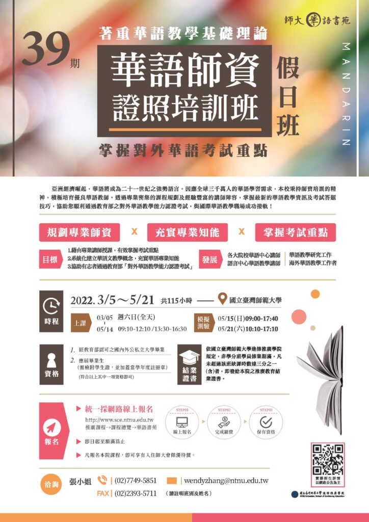 臺師大進修推廣學院將於3、4月份舉辦【2022年華語師資證照培訓班第39期(假日班)】及【(線上同步課程)2022年華語師資證照培訓班第40期(平日晚間班)】。